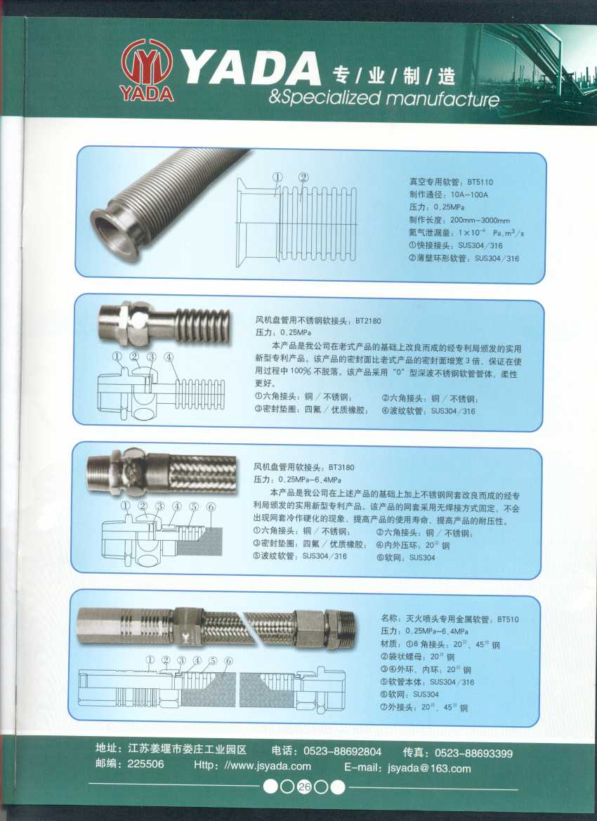 秉天時 籍地利 仰人和 虔誠一個永恒的理念,創新永續.百諾不如一信,亞達人堅持以信為本,視客戶如同上帝,把對信譽的追求,體現在嚴格的質量控制和完善的客戶服務上,讓客戶百分之百滿意是亞達人不變的信念。 本廠系ISO9001質量認證企業、計量合格企業。本廠專業致力于生產不銹鋼金屬波紋軟管、超高壓、高壓膠管、波紋管補償器(膨脹節)、立式、臥式、冷卻器。本廠產品具有承受壓力高、彎曲半徑小、抗疲勞性能強、使用壽命長等特點。廣泛應用于電力、石化、冶金、水泥建材、工程機械、礦山及液壓系統。產品暢銷全國各地。 今日亞達之成功源自諸多客戶的厚愛,明天的輝煌更離不開您對我的支持與信賴。查看更多>>